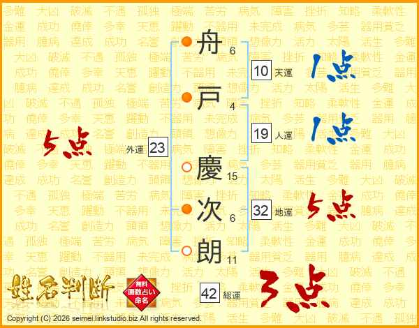 舟(6画)戸(4画) 慶(15画)次(6画)朗(11画)