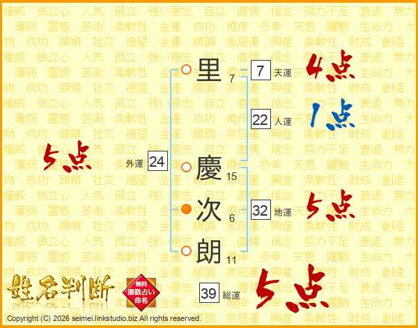 生活面を象徴する運勢です。外部から受ける影響力を表し、結婚運、家庭運や職場、環境への順応性を表します。総運から人運を引いた画数。姓や名が1文字の場合を除く。