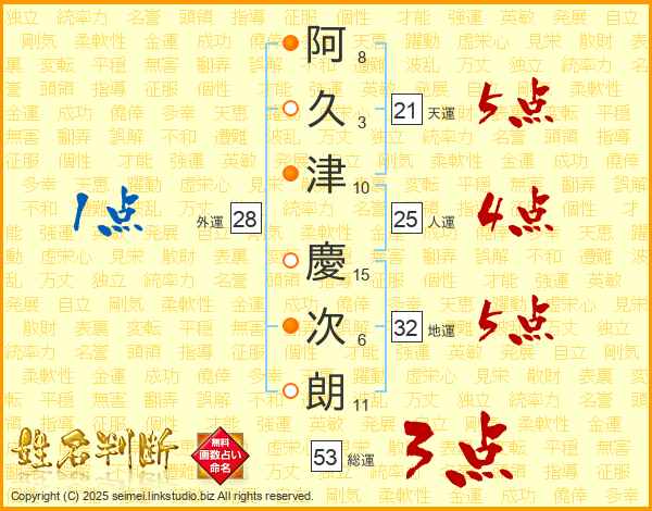 阿(8画)久(3画)津(10画) 慶(15画)次(6画)朗(11画)