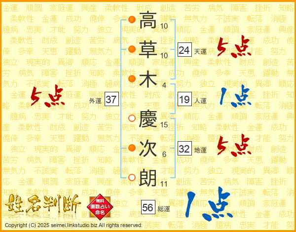 高(10画)草(10画)木(4画) 慶(15画)次(6画)朗(11画)