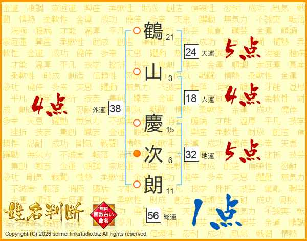 鶴(21画)山(3画) 慶(15画)次(6画)朗(11画)