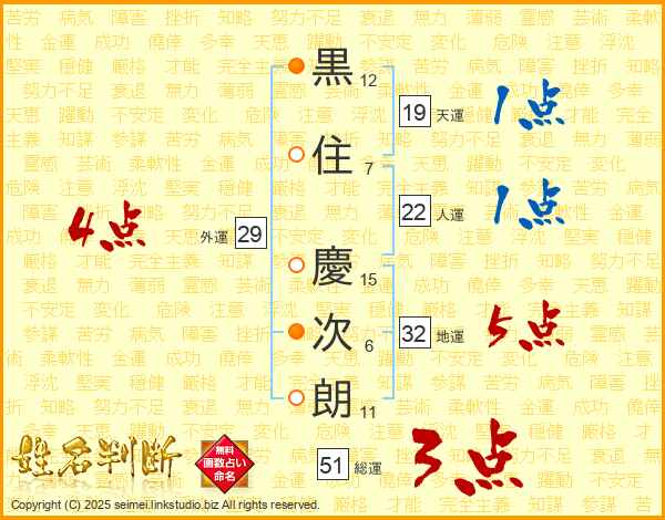 黒(12画)住(7画) 慶(15画)次(6画)朗(11画)