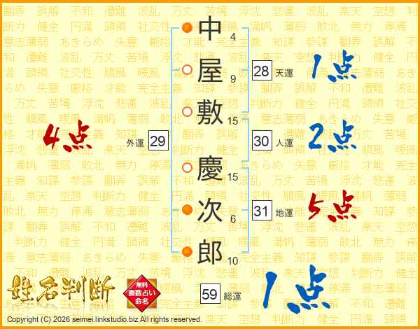 中(4画)屋(9画)敷(15画) 慶(15画)次(6画)郎(10画)