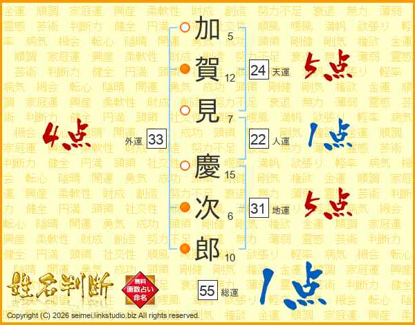 加(5画)賀(12画)見(7画) 慶(15画)次(6画)郎(10画)