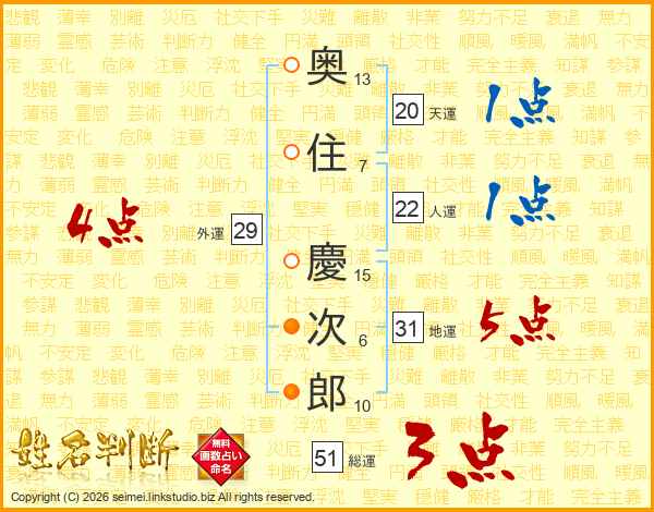 奥(13画)住(7画) 慶(15画)次(6画)郎(10画)
