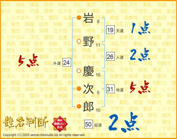 岩(8画)野(11画) 慶(15画)次(6画)郎(10画)