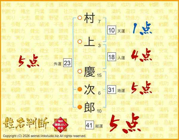 村上慶次郎さんの総運は41画の5点!