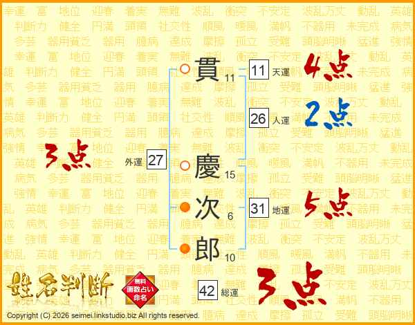 貫(11画) 慶(15画)次(6画)郎(10画)