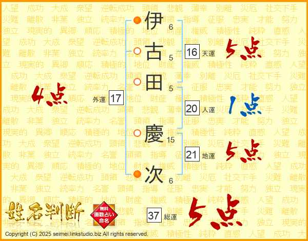 伊(6画)古(5画)田(5画) 慶(15画)次(6画)