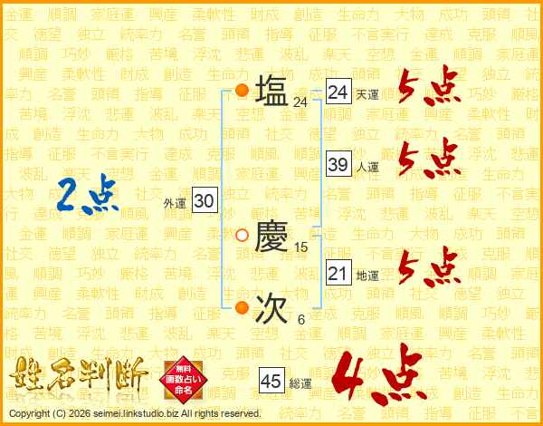 生活面を象徴する運勢です。外部から受ける影響力を表し、結婚運、家庭運や職場、環境への順応性を表します。総運から人運を引いた画数。姓や名が1文字の場合を除く。