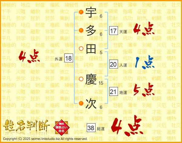 宇(6画)多(6画)田(5画) 慶(15画)次(6画)