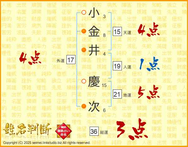 小(3画)金(8画)井(4画) 慶(15画)次(6画)