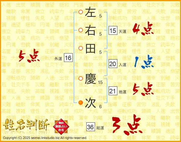 左右田慶次さんの外運は16画の5点!