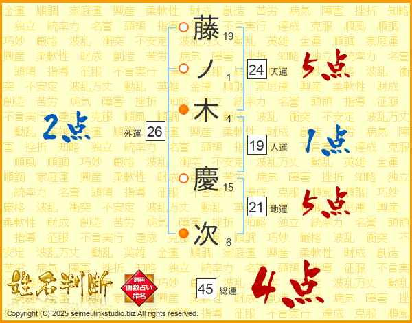 藤(19画)ノ(1画)木(4画) 慶(15画)次(6画)