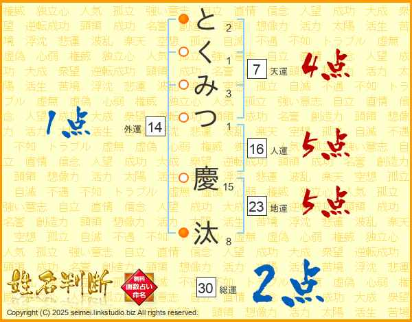 と(2画)く(1画)み(3画)つ(1画) 慶(15画)汰(8画)