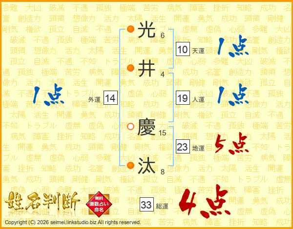 生活面を象徴する運勢です。外部から受ける影響力を表し、結婚運、家庭運や職場、環境への順応性を表します。総運から人運を引いた画数。姓や名が1文字の場合を除く。