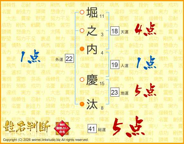堀(11画)之(3画)内(4画) 慶(15画)汰(8画)