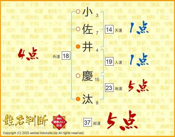 小(3画)佐(7画)井(4画) 慶(15画)汰(8画)