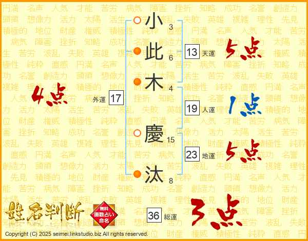 小(3画)此(6画)木(4画) 慶(15画)汰(8画)