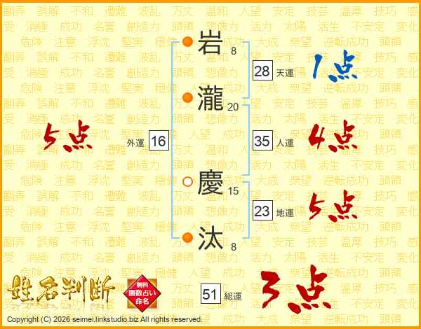 岩(8画)瀧(20画) 慶(15画)汰(8画)