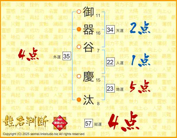 御(11画)器(16画)谷(7画) 慶(15画)汰(8画)