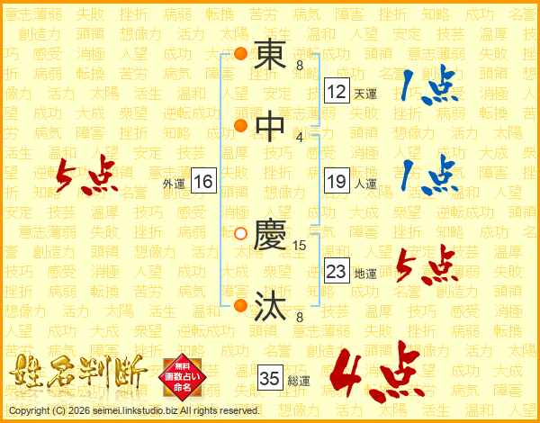 東(8画)中(4画) 慶(15画)汰(8画)