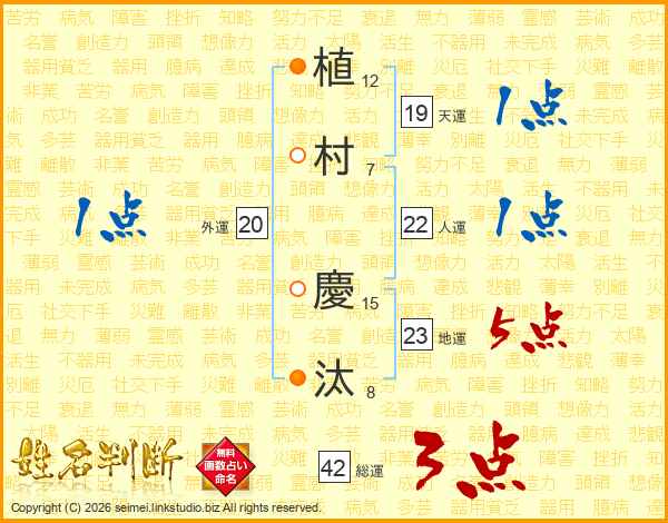 植(12画)村(7画) 慶(15画)汰(8画)