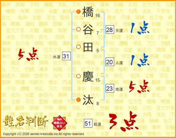 橋(16画)谷(7画)田(5画) 慶(15画)汰(8画)