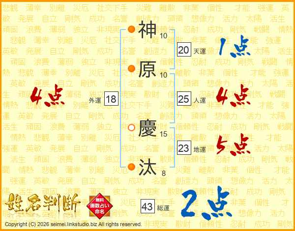 神原慶汰さんの総運は43画の2点!