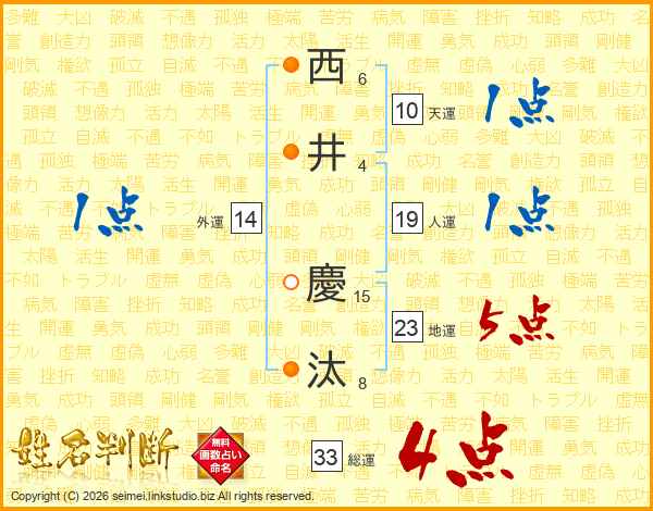 西(6画)井(4画) 慶(15画)汰(8画)