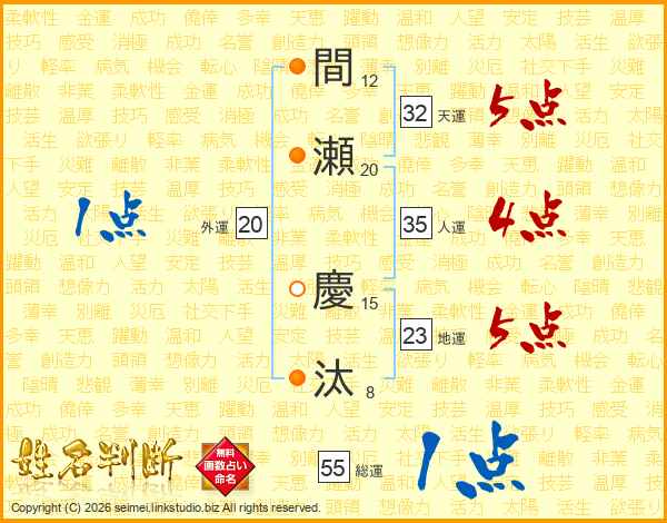 間(12画)瀬(20画) 慶(15画)汰(8画)
