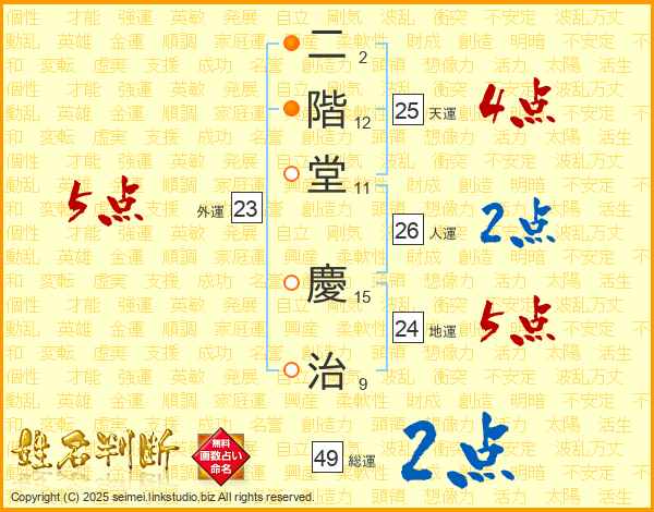 二(2画)階(12画)堂(11画) 慶(15画)治(9画)