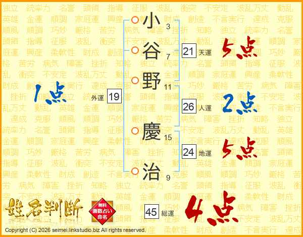 小(3画)谷(7画)野(11画) 慶(15画)治(9画)