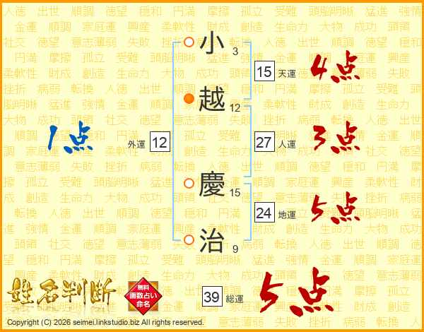 生活面を象徴する運勢です。外部から受ける影響力を表し、結婚運、家庭運や職場、環境への順応性を表します。総運から人運を引いた画数。姓や名が1文字の場合を除く。