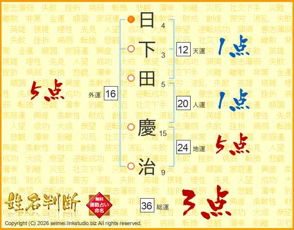 日(4画)下(3画)田(5画) 慶(15画)治(9画)