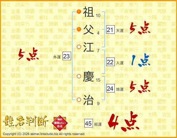 祖父江慶治さんの総運は45画の4点!