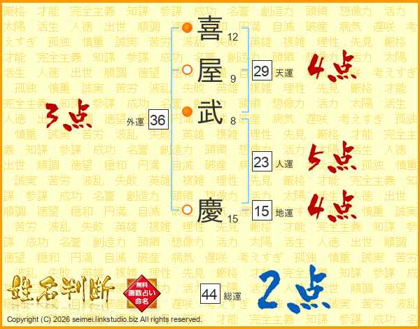喜(12画)屋(9画)武(8画) 慶(15画)