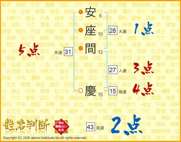 生活面を象徴する運勢です。外部から受ける影響力を表し、結婚運、家庭運や職場、環境への順応性を表します。総運から人運を引いた画数。姓や名が1文字の場合を除く。