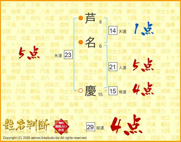 生活面を象徴する運勢です。外部から受ける影響力を表し、結婚運、家庭運や職場、環境への順応性を表します。総運から人運を引いた画数。姓や名が1文字の場合を除く。