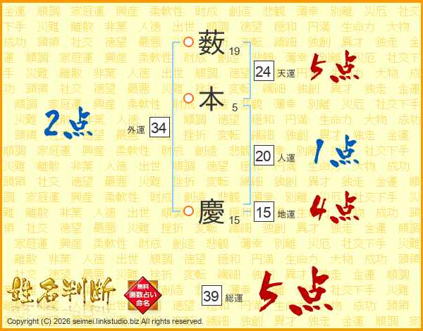 薮本慶さんの総運は39画の5点!