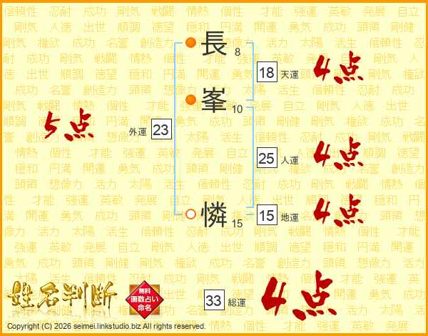 家系が持つ宿命的な運勢を表します。祖先から受け継いだ苗字ですので自分の力が及びません。家柄を象徴します。苗字の合計画数。