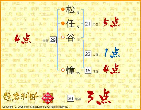 あなたの人生を表す1番重要な運勢です。生涯を通じて影響する総合運となり、主に50歳以降の晩年期に影響を及ぼします。苗字と名前の合計画数。