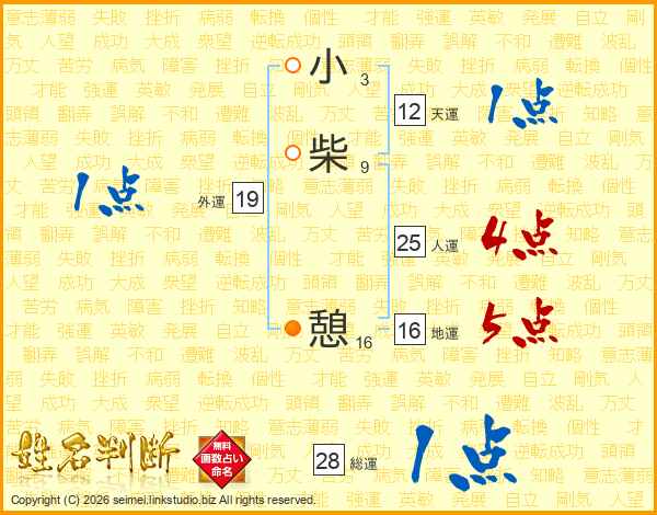 生活面を象徴する運勢です。外部から受ける影響力を表し、結婚運、家庭運や職場、環境への順応性を表します。総運から人運を引いた画数。姓や名が1文字の場合を除く。