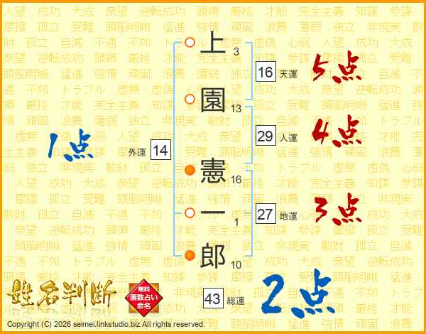 上(3画)園(13画) 憲(16画)一(1画)郎(10画)