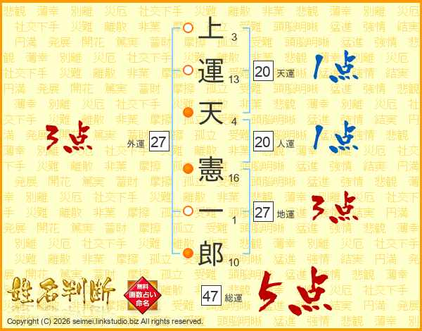 上(3画)運(13画)天(4画) 憲(16画)一(1画)郎(10画)