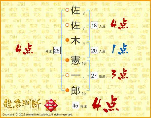 佐(7画)佐(7画)木(4画) 憲(16画)一(1画)郎(10画)
