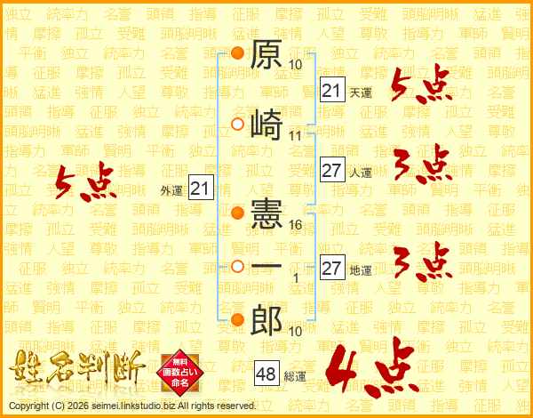 原(10画)崎(11画) 憲(16画)一(1画)郎(10画)