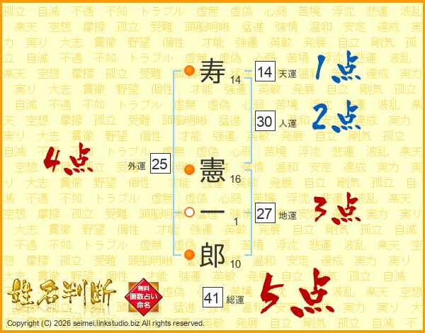 寿(14画) 憲(16画)一(1画)郎(10画)