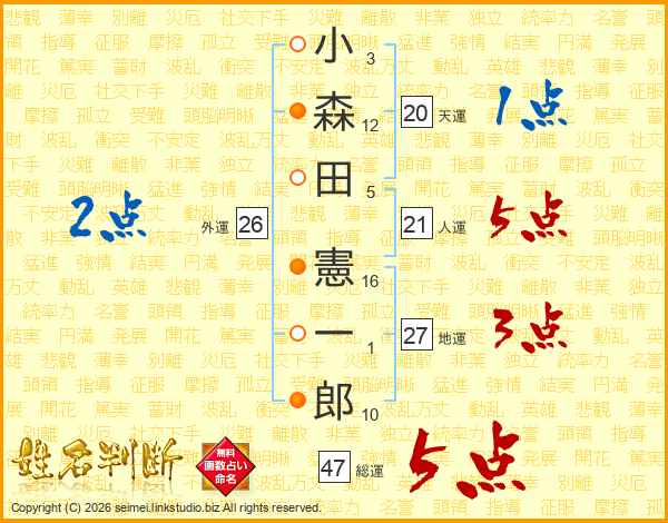 小(3画)森(12画)田(5画) 憲(16画)一(1画)郎(10画)