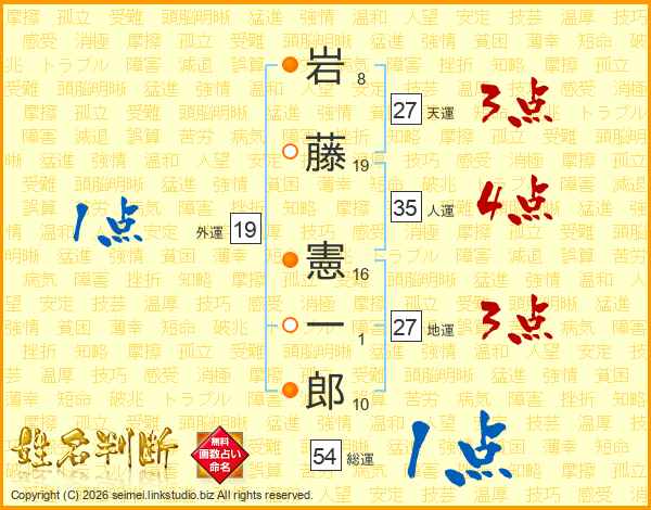 岩(8画)藤(19画) 憲(16画)一(1画)郎(10画)